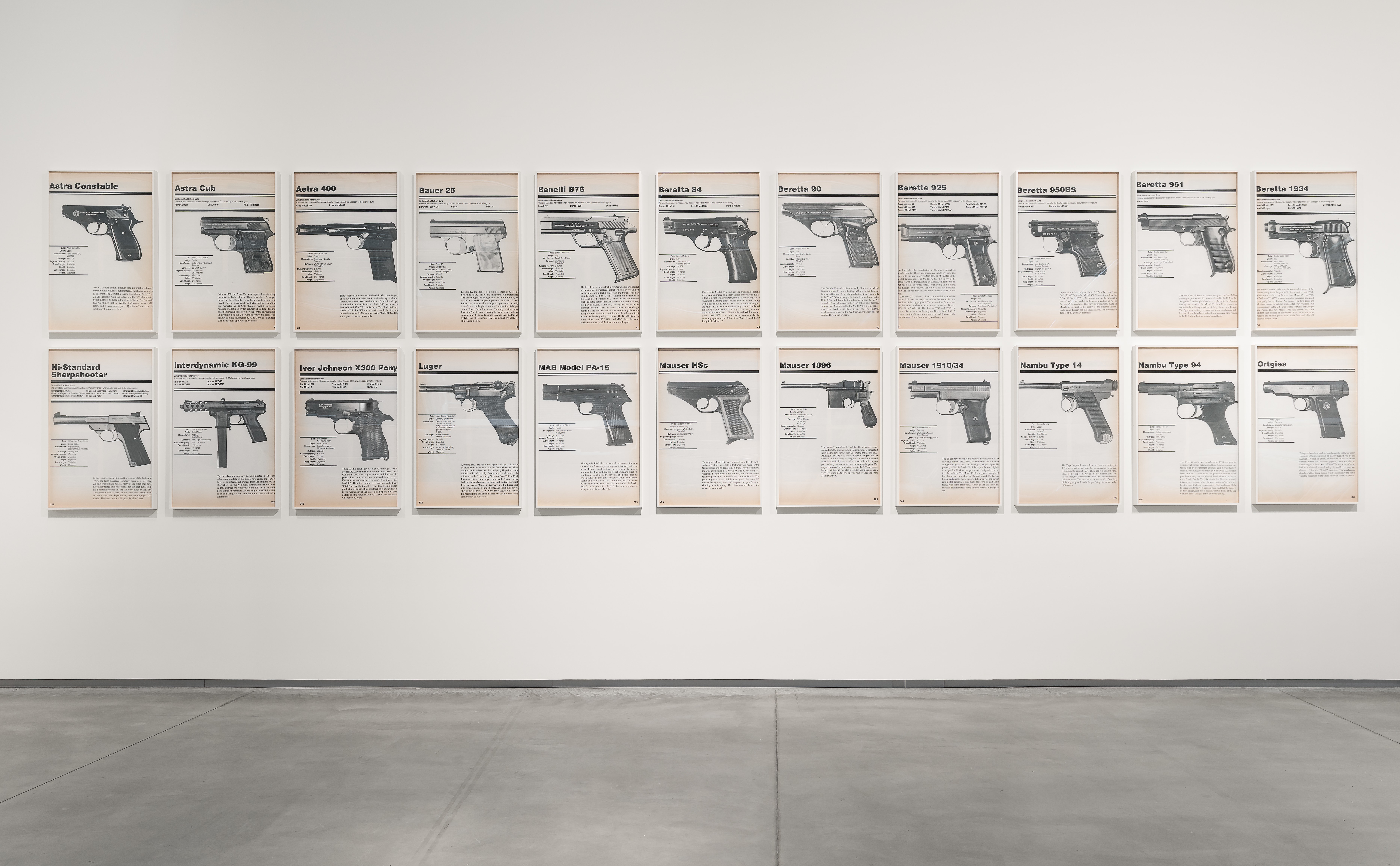 Power mechanisms move inscrutably. FIREARMS consists of framed prints of individual gun models taken from an instruction manual. CZ 27. CZ 45. Smith & Wesson 459. Galesi 25. Together the select pages index technicals, specs, genealogies, skimming names across a history of twentieth century violence in sideway glances, waterboatman-like. Downstairs, press clippings and facsimiles of handwritten preponderances on JFK’s assassination. One gunshot, two gunshots, three. The grassy knoll. A second gunman. Harvey Oswald as stand-in. One line of interpretation splinters into conspiratorial bloom, the case stays open.