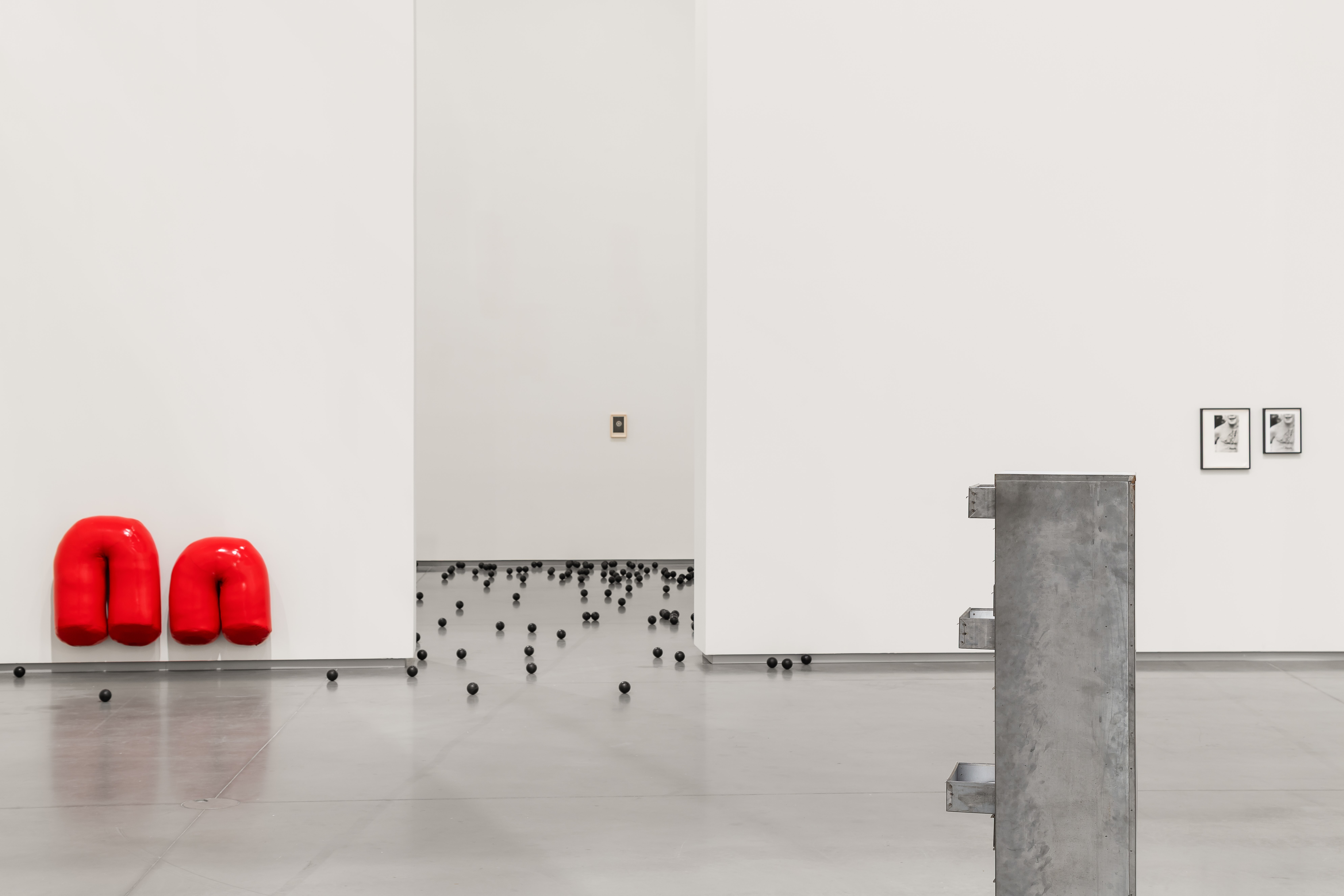 Conceptualism is a word that hovers around Bacher. Upstairs there’s even a facsimile of Marcel Duchamp’s Bicycle Wheel, albeit painted white like Ikea furniture. The show is made up of many such ‘readymades,’ though Duchamp is left spinning. On the first floor, objects are displayed with a thrift-store-find logic. A bowling ball sphere printed blurred green and blue, like a blown-up, botched up map of the Earth. A gingerbread man-like figure of polished wood leans against a wall, angled into a seat by unwieldy hinges. Too big to be a sensible toy, too small and undynamic for human verisimilitude. Not particularly functional as a seat.