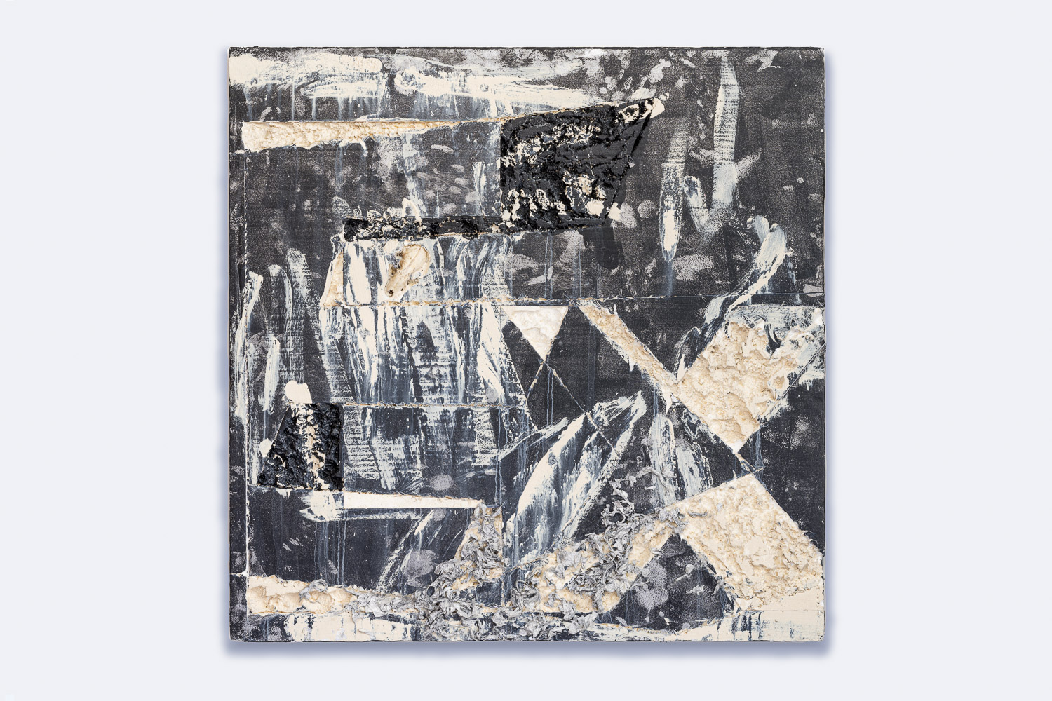 Amazon’s logo is not the only one featured in the American artist’s first European show, at Maximillian William. On wall opposite wall this photograph, four of Hick’s Ex paintings, which incorporate the “Ex” part of the FedEx logo, are displayed side by side. FedEx, known for its transportation and e-commerce services, also incorporates a rightward arrow in its logo. Lined up together, the repetition of this directional symbol creates a dampening effect, signaling that whatever comes next will be more of the same, just repackaged a little differently. This feeling is afforded additional heft by Hick’s use of polystyrene, also known as styrofoam, a multipurpose synthetic material with a range of applications, prime among them packaging to protect and preserve consumer products. From egg cartons to the Styrofoam peanuts protecting online purchases, polystyrene is everywhere, and yet ignored for the item – the valuable thing – it protects. Although polystyrene probably filters out of an individual’s consciousness as an innocuous material after it has been removed and discarded, it reappears on a larger and more threatening scale in the context of our collective existence. It is produced en masse but cannot be recycled. It just accumulates, mostly in landfills where it sits for roughly half a millennium, waiting to decompose.