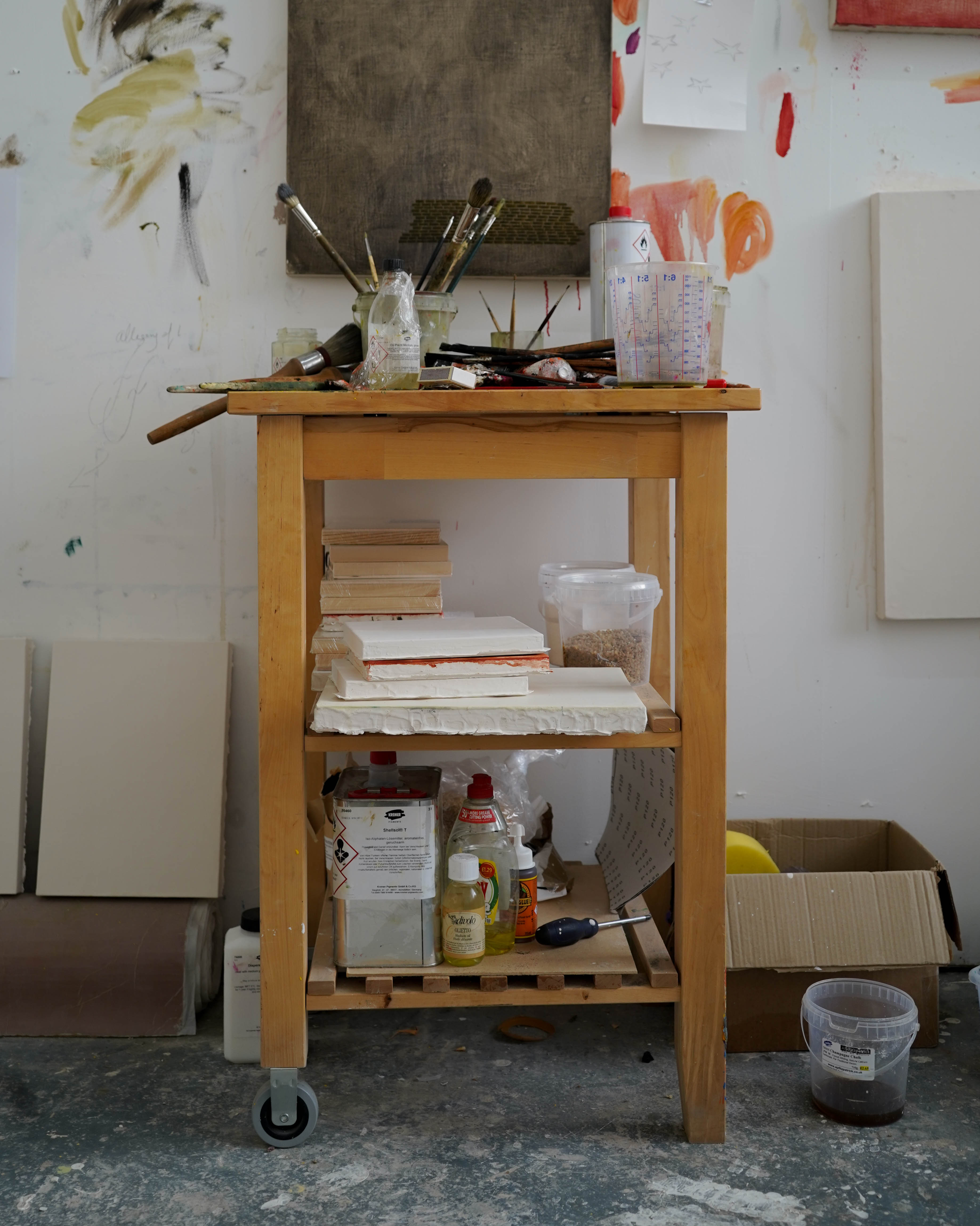 The storage box and the tyre, both ready-made objects function as hybrids, they are replicas, relics of the paintings where labour is being re-coded. For instance one of these objects can be reduced to a purely functional one; a lamp. Maybe it is an attempt to propose an analogy with the way you could build a painting. Pathos driven theories become a retrograde semblance of interiority.